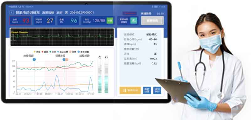 智能技术手段全程监测辅助运动康复训练,结合物联网、可穿戴、人工智能等技术,实时监测并获取患者康复训练中的动态多参数生理数据和物联参数,从而评估训练风险,智能调节物联设备参数,定量评价训练强度和效果,辅助医生、康复治疗师为患者制定和执行个性化、安全、精准的运动康复训练处方。